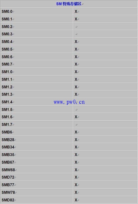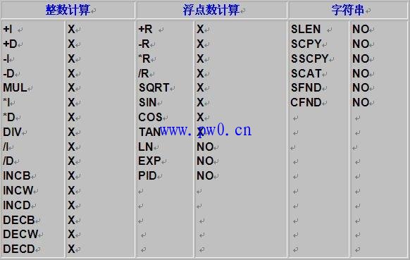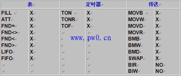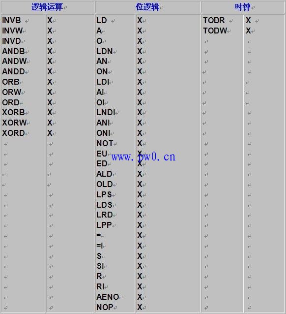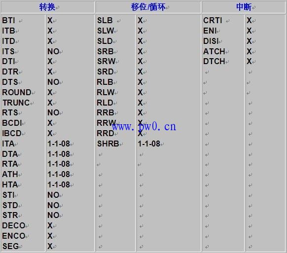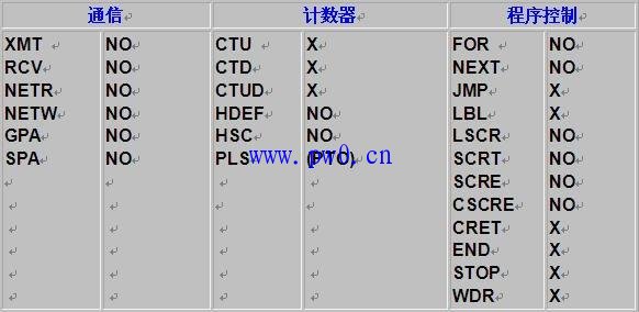 3.下图表是本软件所支持的指令,“X"表示支持,“NO”表示不支持,“1-1-08”表示在08年1月1日后的版本中支持此指令,例如移位寄存器指令SHRB在08年1月1日之前的版本中不支持,之后的版本均支持此指令。