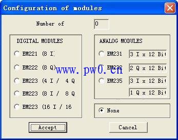 在模块扩展区的空白处点击,弹出模块组态窗口,如附图3所示。在窗口中列出了可以在仿真软件中扩展的模块。选择需要扩展的模块类型后,点击Accept按钮即可。