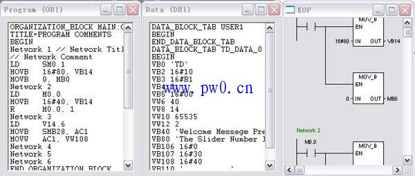 加载成功后,在仿真软件中的AWL、KOP和DB1观察窗口中就可以分别观察到加载的语句表程序、梯形图程序和数据块。
