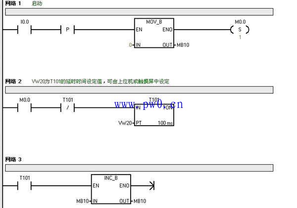 2、用定时器T101作自振荡器,其定时时间不设为具体数值,而用VW20代替,其VW20可由触摸屏设定,这样就可实现动作的时间间隔也可以随时设置的作用。