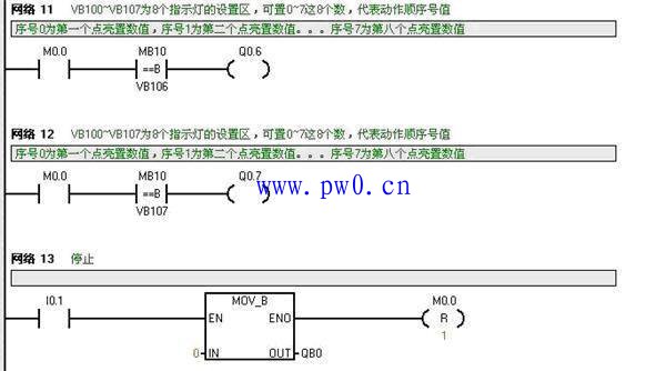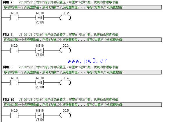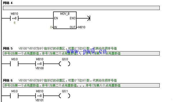 3、顺序随意控制的构思:为实现8个灯能按各自标示区(即VB100~VB107)置数的大小依次点亮,实现的办法是采用一个计数器(MB10),计数器由0开始,按给定的间隔进行加1计数,加到数=8立即请0,重新由0作加1计数。这样:MB10的值将在0~7这8个数字变化,在计数过程中,又时时用计数器的计数值(MB10)与VB100~VB107的值进行比较,与MB10值相等的标示区对应的灯亮,如:当MB10=0时,如VB103=0,则使VB103对应灯(Q0.3)为第一个点亮,接着MB10=1,如 VB00=1,则使VB100对应灯(Q0.0)为第二个点亮……从而实现按8个标示区的数由0、1、2…7,依次点亮。按上述2、3二点思路进行编程就是本程序的编程技巧之处。下面用S7-200编程如下,供你参考
