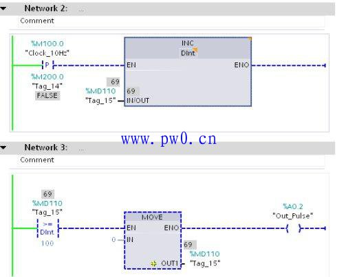 标志M100.0将被分配为10 Hz频率的脉冲,也就是说它每0.1秒改变一次状态。图04中展现了让“IN/OUT”引脚的操作数MD110循环递增的例子。比较指令连接MOVE指令使得当操作数到达99时将被复位为 0。