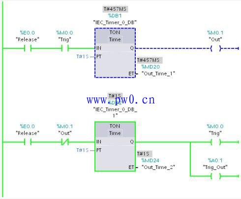 8、标志 M0.1 的 “False”信号将重新触发下面一条“TON"”指令,然后整个过程再次重新开始。