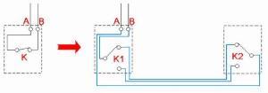 稍微解释一下:图中A、B就是原有线路中的开关线,把原有的单极开关(K)拿掉,换上双极开关(K1),通过走线槽由这个原有的开关盒(K1)过3根线到新的开关盒(K2),图中A、B两根线不必区分,也就是说哪根是A哪根是B无所谓,双极开关中的两个极(K1、K2中垂直方向并排的那两组开关端子)也不必区分。
