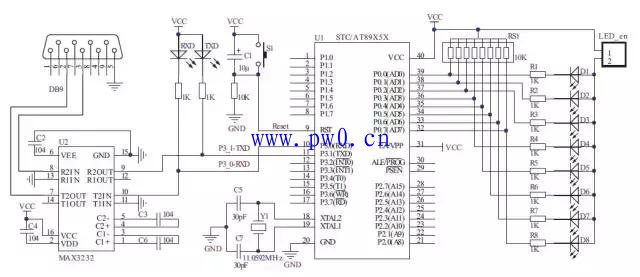 最小系统部分(时钟电路、复位电路等)第一讲已经讲过,在此不再叙述。我们重点来了解下与计算机通信的RS-232接口电路。可以看到,在电路图中,有TXD 和RXD 两个接收和发送指示状态灯,此外用了一个叫MAX3232的芯片,那它是用来实现什么的呢?首先我们要知道计算机上的串口是具有RS-232 标准的串行接口,而RS-232 的标准中定义了其电气特性:高电平“1”信号电压的范围为-15V~-3V,低电平“0”
