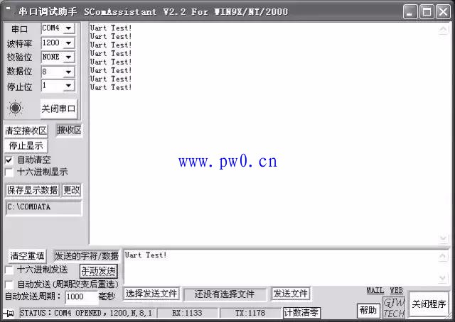 接好硬件,通过冷启动方式将程序所生成的。hex文件下载到单片机运行后,打开串口调试助手软件,设置好波特率1200,复位单片机,然后在通过串口调试助手往单片机发送数据(见图3),可以观察到在接收窗口有发送的数据显示,此外电路板上的串行通信指示灯也会闪烁,P0 口所接到LED灯会闪烁所接收到的数据。