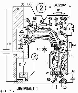 拆开检查,发现电阻R1烧断,三极管V1已击穿短路(c、e极间)。因无图纸资料,为便于分析检修,先后画出印板图(见图2)和电路图(见图1)。因V1(C3588)无法购到,就用一只DK50型晶体管代换;同时更换R1后试机。充电7小时后电池两端电压由1.4V上升到2.5V,此时,V1由于发射极电位升高(基极电压不变)而截止,D6熄灭,充电结束。这样,该剃须刀已能正常使用,修理完成。