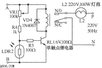 如图所示接收器可避免遗漏病人的求助声音,在白天,只有接收器本身工作,照明灯部分则自动切断。在夜里接收器和照明信号可同时随病人的请求送出。呼叫开关按下时,变压器X1初级也同时与交流电源接通,次级电压经整流、滤波后,其输出直流电压经R1送至VT1集电极。如果在白天,因受光线照射,光敏电阻LDR1呈低阻状态,VT1导通,其集电极拉至地电位,因此晶闸管BT136不工作,这时只有呼叫铃声可以听到,照明信号则处于无效状态。在夜间,LDR1因黑暗而呈高阻状态,因此在S1按下后,VT1截止,使滤波后的正直流电压可经R1和R3对晓充电。VD3的作用可使恒定的直流正偏压触发BT136,从而使白炽灯L1发光,因此在夜问既可听到铃声,又可看到求助的照明信号。齐纳二极管ZD1用来限制C2两端的电压维持在设定的稳定值。A、B点右侧的电路部分也可更换成下图所示电路,不用晶闸管而用继电器来控制照明灯。在白天,因LDR2的低电阻旁路了VT2的基极电流使VT2截止,继电器RL1不工作。在晚上,LDR2几乎呈开路状态,基极电流经VR1、R4和R5流入基极使VT1导通,RL1吸合,灯泡L2发光。