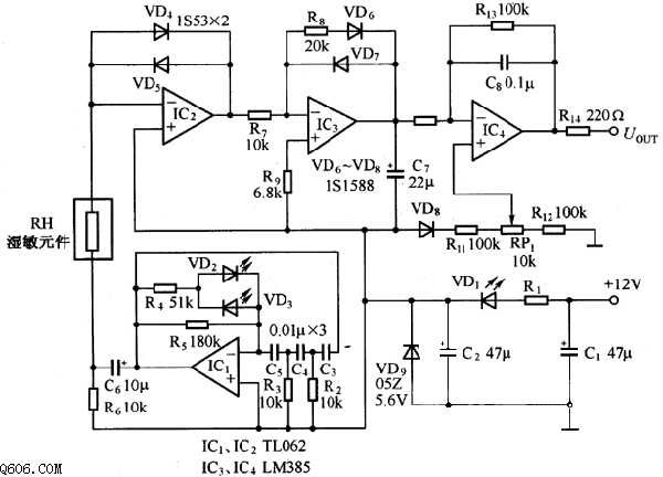 如图所示是金属氧化物湿敏元件应用电路,图中,由IC1及外围元件组成低频振荡器在它的反馈回路中串有两个LED发光二极管VD2、VD3,以提高振荡幅值的稳定性。振荡器可输出频率为9OOHz、1.3V的正弦波信号,作为湿敏元件的工作电压源。IC2与外围元件组成对数压缩电路,它是利用硅二极管VD4、VD5正向电压与电流成对数关系的特性来实现对数压缩的,从而实现线性化处理,用来补偿湿敏元件的非线性。由于硅二极管VD4、VD5具有-2mV/℃的温度特性,所以可以对湿敏元件起到一定的温度补偿作用,但这种补偿是初步的,可能过大或过小。为了得到精确的补偿效果,在由IC4组成的放大电路中,设置了由VD8及RP1等组成的温补电路,通过调节RP1,可获得理想的温度补偿。IC3组成整流电路,整流后的直流电压经lC4放大后输出。