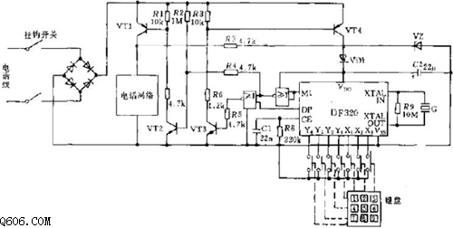 如图所示为采用DF320构成的按钮拨号电路。当电话被提起时,电源接通电路。晶体管VT2通过R2输入基极电流而导通,VT1也随之导通。于是电源通过R3、VD1给VC2充电到(Vdz 0.7)V。当达到Vdd所需的最低工作电压时,DF320网络作为一个阻抗与电话并联。当第一个键入数字被识别时,DF320的时钟被启动,于是DF320引脚M1电平转为“1”,使VT2、VT1截止,而VT3、VT4导通,此时可以依此键入其他数字。