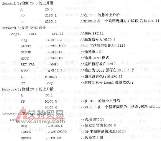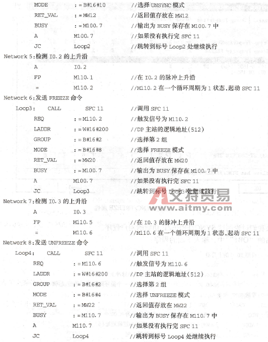 起动DP总线系统后,主站与各从站循环地传送数据。将I0.0设置为1状态,SFC 11发送SYNC命令,使3号从站、4号从站和5号从站的输出处于SYNC模式;将I0.1设置为1状态,SFC 11发送UNSYNC命令,使3号从站、4号从站和5号从站的输出返回正常的周期性输出模式。 将I0.2设置为1状态,SFC 11发送FREEZE命令,3号从站、4号从站和5号从站的输入处于FREEZE模式,改变它们的实际输入信号状态,因为处于锁定模式,这些变化不会传送到主站的CPU,所以不能观察到这些变化。将I0.3设置为1状态,SFC 11发送UN-FREEZE命令,3号从站、4号从站和5号从站的输入返回正常的周期性输入模式。 在I0.0的下一次上升沿,将重新发送SYNC命令,把设置好的数据传送到3号从站、4号从站和5号从站的输出;在I0.2的下一次上升沿,将重新发送FREEZE命令,读取3号从站、4号从站和5号从站当前的输入数据。