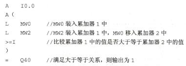 图3-45中,输入信号IO.O的RLO为“1”时,比较整数MWO的值是否大于等于MW2的值,如果是,则输出Q4.0为“1”。