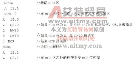 MCRA为激活MCR区指令,表明按MCR方式操作区域的开始,MCRD为取消MCR区,表明按MCR方式操作区域的结束。且MCRA和MCRD要成对出现。MCRA和MCRD指令之间的操作将根据MCR位的状态进行操作。若在其间有BEU指令,则CPU执行此指令,并结束MCR区域。若在其间有块调用指令,则激活状态不能继承至被调用的块中去,所以必须在被调用的块中重新激活MCR区域。注意不能使用MCR指令代替需要使用硬件接线的机械主控继电器来实现紧急停车功能。