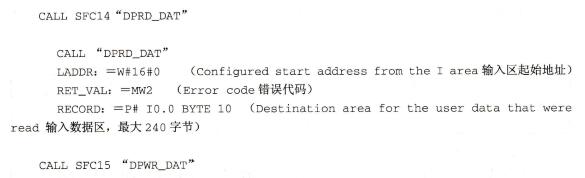 硬件组态完成后,接下来进行程序的编写。对于集成DP口的通信,需要调用SFC14“DPRD_DAT”来读取数据,调用SFC15“DPWR_DAT”发送数据。