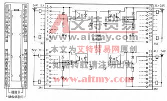 图1-13所示为直流32点数字量输入模块的内部电路和外部接线图,图中只画出了2路输入电路,其中的M为同一输入组内个输入信号的公共端,L+为负载电压输入端。