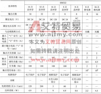 数字量输出模块SM322的技术特性如表1-15所示。模块的每个输出点有一个绿色发光二极管显示输出状态,输出逻辑“1”时,发光二极管点亮。