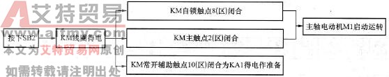 控制电路的电源由控制变压器TC二次侧输出110V电压提供。在正常工作时,位置开关SQ1的常开触头闭合。打开床头皮带罩后,SQ1断开切断控制电路电源以确保人身安全。钥匙开关SB和位置开关SQ2在正常工作时是断开的,QF线圈不通电以确保断路器QF能顺利合闸。当打开配电盘壁龛门时,SQ2闭合QF线圈即得电,断路器QF自动断开。