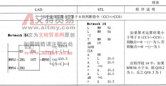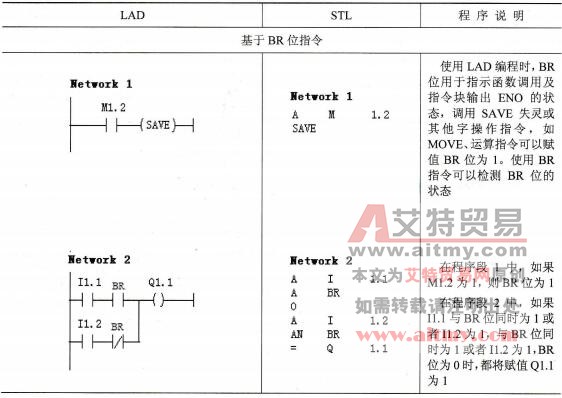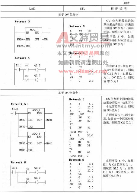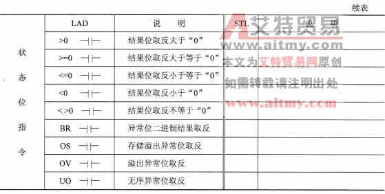 状态位指令是位逻辑指令,针对状态字的各个位进行操作。通过状态位可以判断CPU运算中溢出、异常、进位、比较结果等状态。由于编程方法的原因,状态位指令只能在LAD中使用。STL编程语言中对状态位的信息,有的可以直接使用,有的可以通过跳转指令完成,同样可以实现状态位指令在LAD中实现的功能。在指令示例程序中,将会介绍使用STL编程语言实现的方法。状态位指令如表2-37所示。