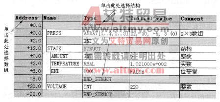 在变量声明表中选择ARRAY(数组)时,用鼠标点击相应行的地址单元。如果想选中一个结构(Structure),用鼠标选中结构的第一行或最后一行的地址单元,即有关键字SIRUCT或END_STRUCT的那一行。若要选择结构中的某一参数,用鼠标点击该行的地址单元。选择方法如图4-7所示。