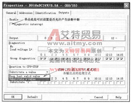 ③CPU进入STOP时的响应:可以选择不输出电流电压(OCV)、保持最后的输出值( KLV)和采用替代值(SV)。