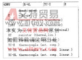 可以分别对模块的每一通道组选择允许的任意量程,每两个通道为一组。例如,在图3-59中的“Inputs”选项卡中点击0号和1号通道的测量种类输入框,如图3-60所示。在弹出的菜单中选择测量的种类,选择“4DMU”是4线式传感器电流测量;“R-4L”是4线式热电阻;“TC-1”是热电偶;“E”表示测量种类为电压。