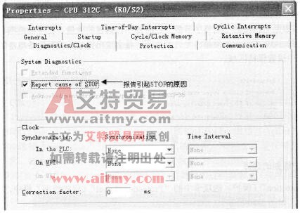 在“Properties”窗口点击“Diagnostics/Clock”(诊断与时钟)选项卡,如图3-37所示,可以选择“Report cause of STOP(报告引起STOP的原因)”等选项。
