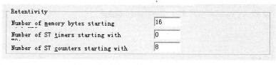 “Retentivity Memory”(保持存储器)选项卡中的的“Number ofmemory bytes from MBO”,“Number of S7 times TO”和“Number of S7 conuters from CO”分别用来设置从MBO、TO和CO开始的需要断电保持的存储器字节数、定时器和计数器的数量,设置的范围与CPU的型号有关,如图3-39所示。如果超出允许的范围,将会给出提示。没有后备电池的S7-300可以在数据块中设置保持区域。