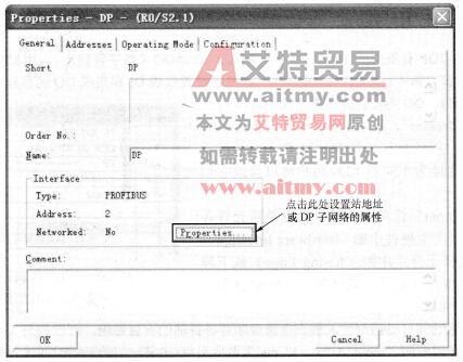 对于有PROFIBUS-DP通信接口的CPU模块,例如CPU 312C-2DP,用鼠标左键双击如图3-45所示窗口内的DP所在行(第3行),在弹出的DP属性窗口中的“Genaral”(常规)选项卡,如图3-46所示,点击“Interface”区域中的【Properties】按钮,可以设置站地址或DP子网络的属性,生成或选择其他子网络。