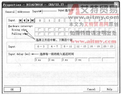 点击“Input”选项卡,可以设置是否允许各集成的DI点产生硬件中断(Hardware Interrupt)。可以逐点选择上升沿中断(Rising Edge)或下降沿中断(Falling Edge).其设置对话框如图3-51所示。