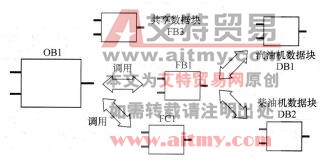 用户程序结构如图4-9所示,其中组织块081是主程序,用一个名为“发动机控制”的功能块FB1来分别控制汽油机和柴油机,控制参数在背景数据块DB1和DB2中。控制汽油机时调用FB1和名为“汽油机数据”的背景数据块DB1,控制柴油机时调用FB1和名为“柴油机数据”的背景数据块DB2。此外控制汽油机和柴油机时还用不同的实参分别调用名为“风扇控制”的功能FC1。