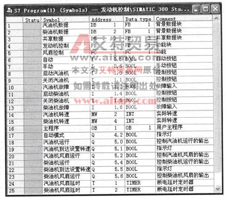 为了使程序易于理解,可以给变量指定符号。在发动机控制SIMATIC管理器的“S7Program (1)”树状目录下,双击“Symbols”图标,如图4-11所示,打开一个空的符号表,然后在里面输入需要的符号、地址、数据类型以及注释,就完成了对符号表的创建。创建好的发动机控制项目的符号表如图4-12所示,符号表中定义的变量是全局变量,可供所有的逻辑块使用。