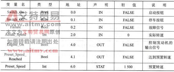 发动机控制中FB1的局域变量如表4-4所示。表中Bool变量(数字量)的初值(InitialValue) FALSE即二进制数0。预置转速是固定值,在变量声明表中作为静态参数(STAT)来存储,被称为“静态局域变量”。