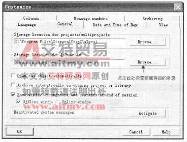 ②设置新建程序库存放的存放目录。菜单命令“Option”→“Customize”打开“Customize”窗口,用“General”选项卡中的“Storage location for libraries”可以设置新库存放在计算机的目录,如图4-15所示。