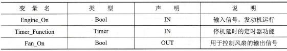 图4-19所示的“汽油机风扇控制”部分是就是调用了功能FC1,功能FC1用于发动机停机后风扇继续运行4s后再停止运行。在符号表中定义了FC1输入变量和输出变量的符号。