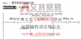 在FC1中,使用了延时断开定时器(S_OFFDT)。在功能的变量声明表中定义了输入变量( Engine_On)和输出变量( Fan_On),调用FC1时将延时断开定时器作为功能的输入变量,数据类型为Timer,FC1用于不同的发动机时可以指定不同的定时器。其对应的梯形图程序如图4-18所示。